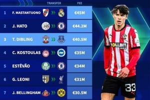 今夏U19球员转会费排名:马斯坦托诺4500万欧居首